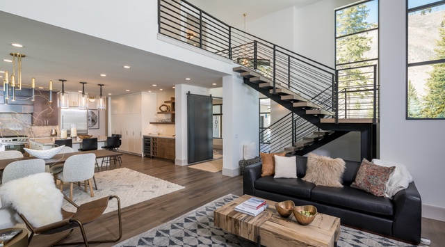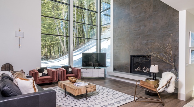 Expansive floor-to-ceiling windows paint this 2-story alpine sanctuary with an ethereal wash of natural light and offer pristine views of the snow-dusted woodlands. Deluxe furnishings and a stately fireplace create a sumptuous space to spend an evening with friends, family, or a best-selling novel in the open great room. Quality entertainment is a click away with a 65” Samsung TV and Sonos sound system. On the opposite end, a lavish kitchen made for hosting transforms every culinary task into a euphoric experience adorned with elegant stone counters, and top-of-the-line appliances—including a Bertazzoni 5-burner stove and wine fridge. A natural gas grill is conveniently located nearby for an après ski BBQ feast. Savor a delectable meal with a bottle of wine as conversation flows at the adjacent 8-person dining table, or grab Sunday brunch from the generous kitchen island that seats 5. A spacious mudroom makes preparing for an outdoor adventure a seamless process, and there is a laundry room for convenience. A well-appointed office with a Murphy bed grants guests a peaceful retreat to check emails or plan the next day’s adventure. The spacious primary bedroom provides endless indulgences with a private balcony and hot tub.
