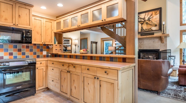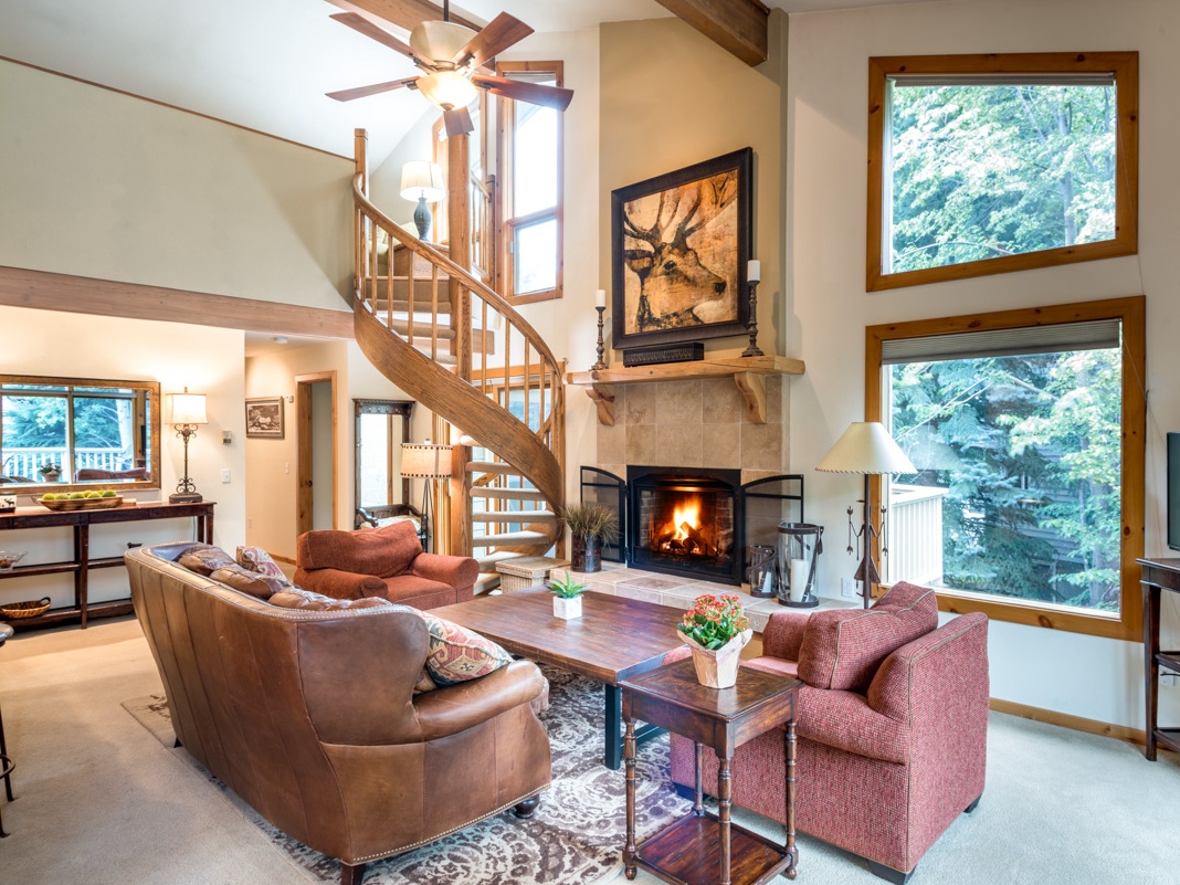 A small bench adorns the entryway landing, which leads guests up a short flight of stairs to the main level of this townhome. Here, a first-floor great room with floor-to-ceiling picture windows creates a bright and inviting space. The living area features a full-length leather sofa and 2 comfortable armchairs that frame a gorgeous gas fireplace and wood coffee table. Above the mantle, a unique impressionist stag portrait adds charm to the cozy, modern alpine atmosphere. Curl up with a good book, unwind in front of the TV, or simply watch the snow fall outside. Beyond the living area is a kitchen featuring KitchenAid appliances that provide all the essentials for preparing home-cooked meals. The breakfast bar, with seating for 2, seamlessly connects the kitchen to the living area, creating an inviting space for casual chats or quick bites. The adjacent dining table with seating for 6 sits near sliding glass doors that lead outside to the patio, offering family and friends a picturesque dining experience with unobstructed views of Greyhawk, Hemingway, and Cozy ski runs—as well as patio seating, BBQ grill, and cozy firepit. When it’s time to retire, the primary bedroom offers a quiet escape with a queen sleigh bed, private bathroom, and sliding glass doors that lead out to a hot tub, which is also accessible from the great room. The second bedroom features a unique formation of twin-over-twin-over-twin bunk beds and a queen bed, with convenient access to a shared hallway bathroom with heated floors. A stackable washer and dryer add convenience to the first floor.