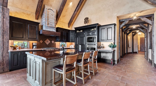 Guests enter an incredible open living, dining, and kitchen area with a vaulted ceiling, exposed timber beams, tall windows, a brick fireplace, and tile floors. A beautiful kitchen blends black granite counters with exposed brick and the warmth of terra cotta. Guests will enjoy the gas range and premium appliances. A unique U-shaped wall is finished with exposed brick and timber beams and houses a dining table that seats 5. Guests can unwind in the living area on a sofa and armchairs surrounding a gorgeous brick fireplace and windows that show the beauty of Flathead Lake. French doors open to a stone back deck with a Traeger grill and a yard with a gas firepit and private dock. It’s a gorgeous space to stargaze after a day of adventure. There are 2 primary bedrooms and a laundry room with cabinetry off the living area. One primary bedroom has a king bed, exposed brick walls, a spacious private bath, and French doors that open to the backyard. A second primary bedroom has a king bed with a vaulted ceiling, a wet bar, and a private bathroom.