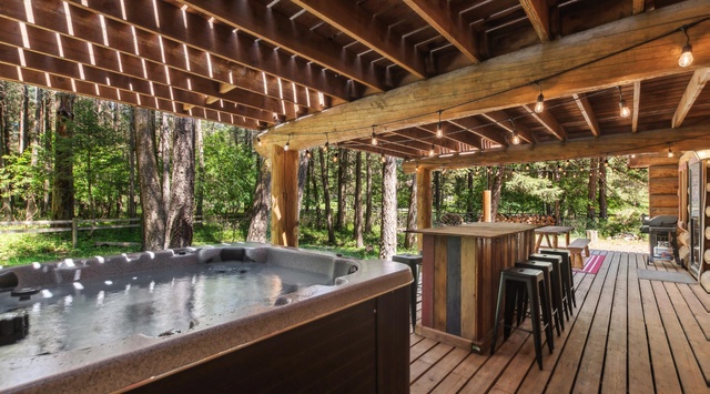 Upon entering this traditional 2-story cabin, guests are immediately enveloped in a warm, welcoming embrace, with exposed wood beams and lodge-like finishing. The open living area, a testament to comfort and relaxation, features a crackling wood-burning fireplace and plush leather furnishings that invite guests to unwind in style. Adjacent to the cozy living area, a robust dining table seats 6, while the inviting kitchen features a welcoming breakfast bar with seating for 5 more. The kitchen's copper-wrapped counters and high-end appliances transform meal preparation from a mundane task into an enjoyable experience. A short journey down the hallway reveals a quaint guest bedroom, where a queen bed awaits beneath the soft glow of a 50” TV. Situated at the hallway's end, the laundry room features a washer and dryer and offers backyard access, where a bench and hooks create an ideal area for shedding wet ski or fishing gear. From the living area, guests can venture into the backyard, which boasts a spacious deck adorned with a hot tub, patio tables, string lights, and a grill for outdoor entertainment.