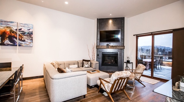 Living, dining, and kitchen spaces merge in this open condo featuring high ceilings and rustic charm. Step into the kitchen to find high-end appliances and concrete countertops, along with a breakfast bar that seats 4. The dining table seats 6—so guests can gather over a warm meal after a day of activities. Defrost by the fireplace in the living area, with ample cozy seating and a TV. Head out to the large balcony to experience the sweeping mountain views. Comfortable outdoor seating, a grill, a 6-person dining table, and a hot tub encourage guests to spend time in the fresh Montana air. Enjoy a nightcap or relax with a late-night soak! A stacked washer and dryer are in the hall closet.