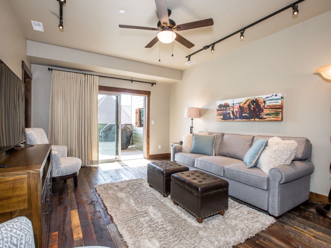 This Second-floor loft has an open layout that blends the kitchen, dining, and living areas for easy conversation. Beautiful wood flooring stretches end-to-end in the great room for added warmth and charm. An inviting kitchen provides all the comforts of home with a spacious island that seats 3, granite countertops, Alder wood cabinetry, and high-end appliances. A stacked washer and dryer are hidden in the closet next to the refrigerator to keep ski gear fresh. There’s a traditional dining area with 6 plush chairs under a modern light fixture. Next to the dinner table is a designated workspace with a desk and laser printer for convenience. The living area provides a comfortable place to gather with 2 matching armchairs and a king-sized sleeper sofa with a gel mattress for additional guests. When it's time to retire, guests can choose from 2 guest bedrooms. Both bedrooms have delightful king beds, TVs, and something special for avid skiers and snowboarders—a weather station clock. Nestled in the heart of Baker Avenue, this beautiful home boasts a feature that truly sets it apart from the rest: a spacious and private balcony that overlooks the bustling street below. With sliding glass doors leading out, friends and family can take in the vibrant energy of the neighborhood from above. Fire up the grill and watch the big game on the outdoor TV or unwind under the stars while lounging in cozy seating around the fire table.