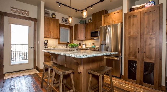 DETAILS: Baker Loft 203 is a lovely 2-bedroom, 2-bathroom condo that sleeps 6 conveniently located in downtown Whitefish. This ground-floor unit is within walking distance to local shops and restaurants, as well as the free S.N.O.W. Bus that takes guests to Whitefish Mountain Ski Resort. Guests will love the modern mountain charm of this 1,200-square-foot home, complete with a balcony directly overlooking Baker Avenue.