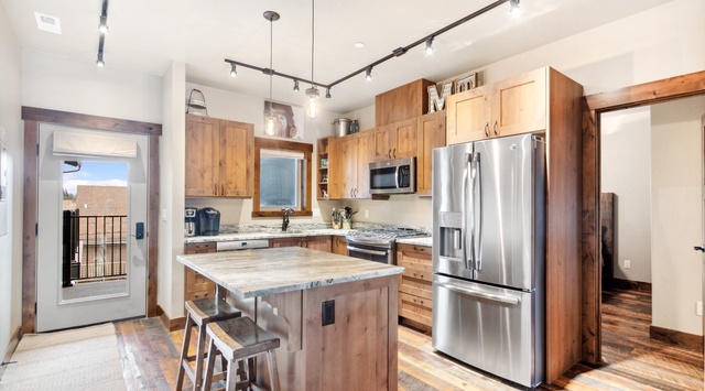 Upon entering the condo, guests are welcomed into an open kitchen, living, and dining area. A spacious kitchen features granite countertops, a 5-burner gas range, a Keurig coffee maker, a stacked washer and dryer, and a dine-in island that seats 2, or guests can gather for meals at a dining table that seats 6. Opposite the dining area are 2 bedrooms. A primary bedroom has a king bed and a private bathroom with a shower/tub combo, and a twin rollaway bed is stored in a spacious closet. A guest bedroom has a queen bed, a shared bathroom with a shower/tub combo, and a twin rollaway bed in the closet. In the cozy living area, guests can relax on a king sleeper sofa, watch a movie on the TV while enjoying a SONOS sound system, or soak in the mountain and downtown views through sliding glass doors that open onto a fantastic balcony. After a fun-filled day on the slopes, the private hot tub is the perfect place to unwind. Or, make a hot cider and gather around the gas fire table for a night of storytelling as the sun sets and the stars begin to shine.