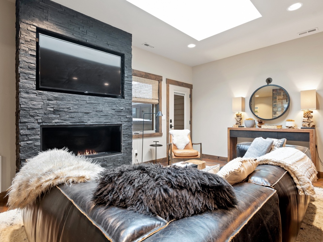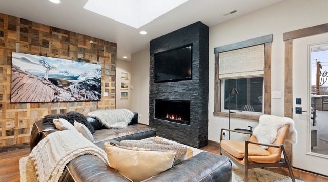 DETAILS: Central Loft 303 is a gorgeous 3-bedroom, 2-bathroom property located in the heart of downtown Whitefish on Central Avenue, offering a spacious open floor plan with a distinctly modern vibe. The chef’s kitchen is fully equipped with granite countertops, designer cabinets, and stainless appliances, including a gas range. The kitchen open to the dining area, where guests will find table seating for 2 and bar seating for 4. The living room features a large TV, a vast comfortable sofa—and a bio-ethanol fireplace! Central Loft 303 comfortably sleeps 8 guests.