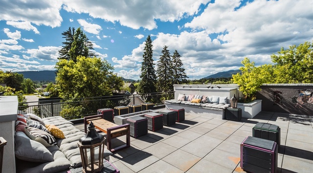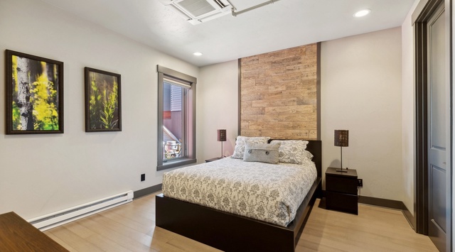 This stunning, single-story unit flaunts a vibrant red façade and is located on the third floor with sweeping southwest-facing views of the city and the Valley. A long hallway adorned with bedrooms on one side allows guests to easily drop off luggage before residing in the great room. A stylish primary bedroom outfitted with a queen bed and private bathroom with a custom walk-in shower can be found off the immediate entryway, with an additional guest bedroom next door boasting a sliding barn door and spacious queen bed. The heart of this unit is the open great room, filled with natural light from large windows. It houses a comfortable living area with plush furniture, including a 2-person sleeper sofa for additional guests. The dining area, which seats 6 under a modern light fixture, leads to a well-equipped kitchen complete with premium appliances and high-end finishes.Step outside onto the lovely balcony to enjoy expansive mountain views—an ideal spot for sipping morning coffee or indulging in a nightcap. The true gem of this condo is the communal rooftop deck with ample seating. A BBQ grill and firepit area make this the ultimate spot for enjoying panoramic alpine views.