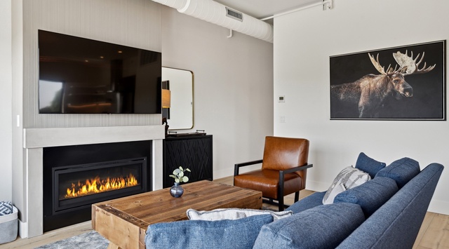 Discover the perfect blend of style and comfort in this impeccable penthouse. The spacious open floor plan is ideal for entertaining as it seamlessly blends the kitchen, living, and dining areas. Enjoy abundant natural lighting that fills the room, creating a bright and airy ambiance. Relax in the cozy living area, which is warm and inviting, with comfortable seating and a lovely fireplace. The modern kitchen, featuring stunning granite countertops, exposed shelving, and high-end appliances, is a dream for anyone who loves to cook. A stylish dining area with plush chairs seats 6, while the quaint breakfast bar can seat 3 more. Choose from 2 comfy bedrooms when it's time to retire—1 primary bedroom boasting a luxurious king bed, Smart TV, and private bathroom, as well as 1 bunk room with a spacious queen-over-queen bed and a Smart TV. This unit also includes a stacked washer and dryer in the hallway closet.