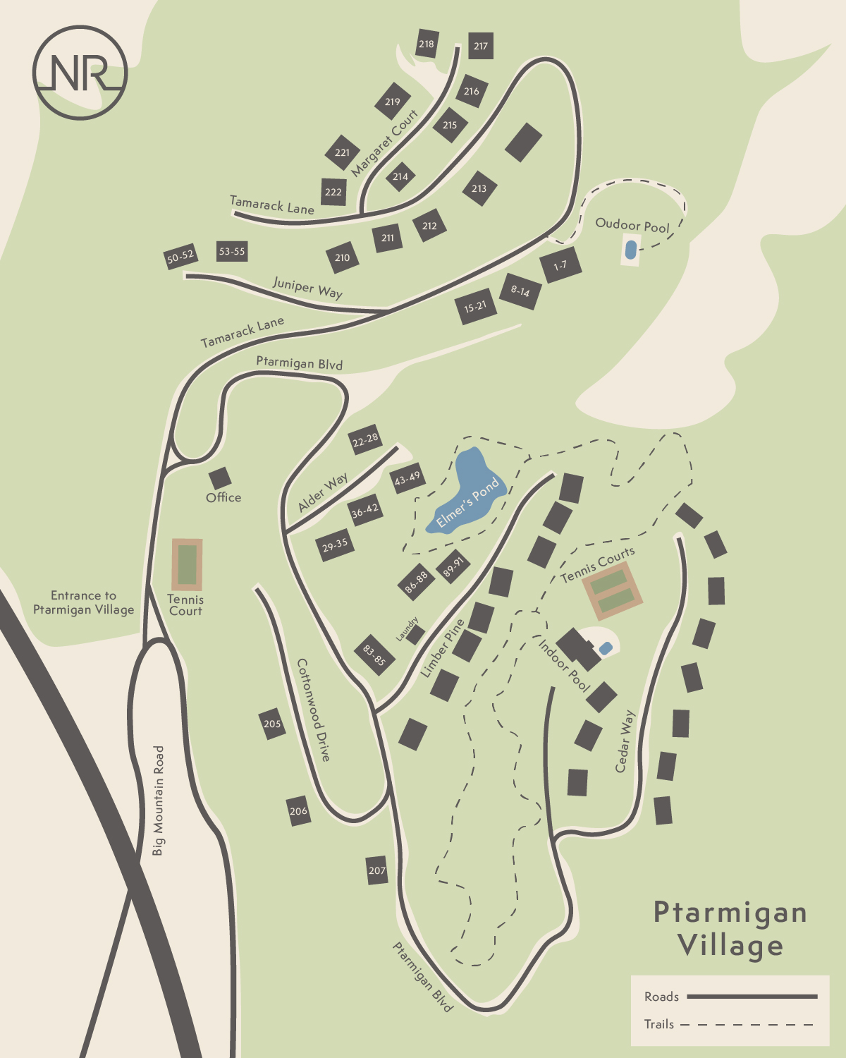 Spanning 52 forested acres—only 2 miles from Whitefish Mountain Resort—Ptarmigan Village is a destination unto itself. Whether you choose a cozy cabin-style condo or a sleek modern mountain home, you'll find yourself immersed in a vibrant community surrounded by stunning walking trails, tennis courts, playgrounds, and endless opportunities for year-round adventure.
