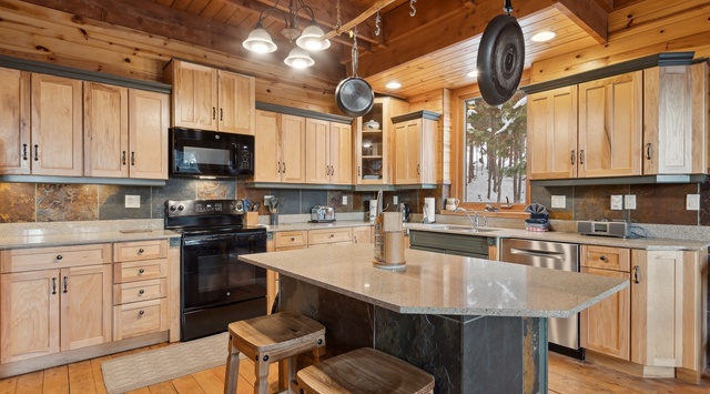 Cathedral ceilings, large windows, and warm wood floors greet guests as they enter the heart of this 3-story retreat. Packed with all the comforts of home, the open home blends the kitchen, dining, and living areas for seamless communication between spaces. A finely appointed living area provides warmth and comfort with a stacked stone fireplace and plush furnishings—perfect for unwinding after an adventurous day. Play a board game or enjoy a home-cooked meal in the well-lit dining area with seating for 6. The adjacent kitchen is fully equipped with high-end appliances, gorgeous countertops, and an island that seats 2 sous chefs for meal prep.