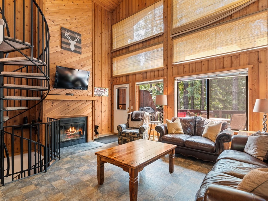 A charming spiral staircase leads guests upstairs to the open loft area with 2 full beds and gorgeous views from the windows.
