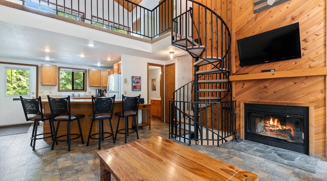 This exquisite tri-level condo, designed to provide all the comforts of home, welcomes guests inside with a spacious open floor plan on the main level. Tall ceilings, large windows, and beautiful wood accents showcase this retreat’s charm while evoking a warm and inviting ski lodge ambiance. Cozy up in the living area on the plush furniture situated near a wood-burning fireplace with a TV mounted overhead—perfect for gathering with friends and family. An adjacent, open kitchen is fully equipped with everything needed to prepare a delicious home-cooked meal, and the large island provides ample space for up to 4 people to dine comfortably. In the Summer, step outside onto the private deck, accessible right off the great room, and enjoy breathtaking wooded views of the surrounding area. Take advantage of the BBQ grill and outdoor seating, where guests can enjoy a delightful alfresco dining experience.