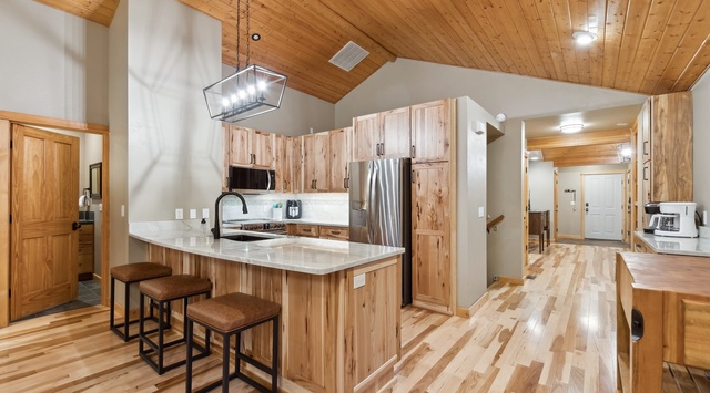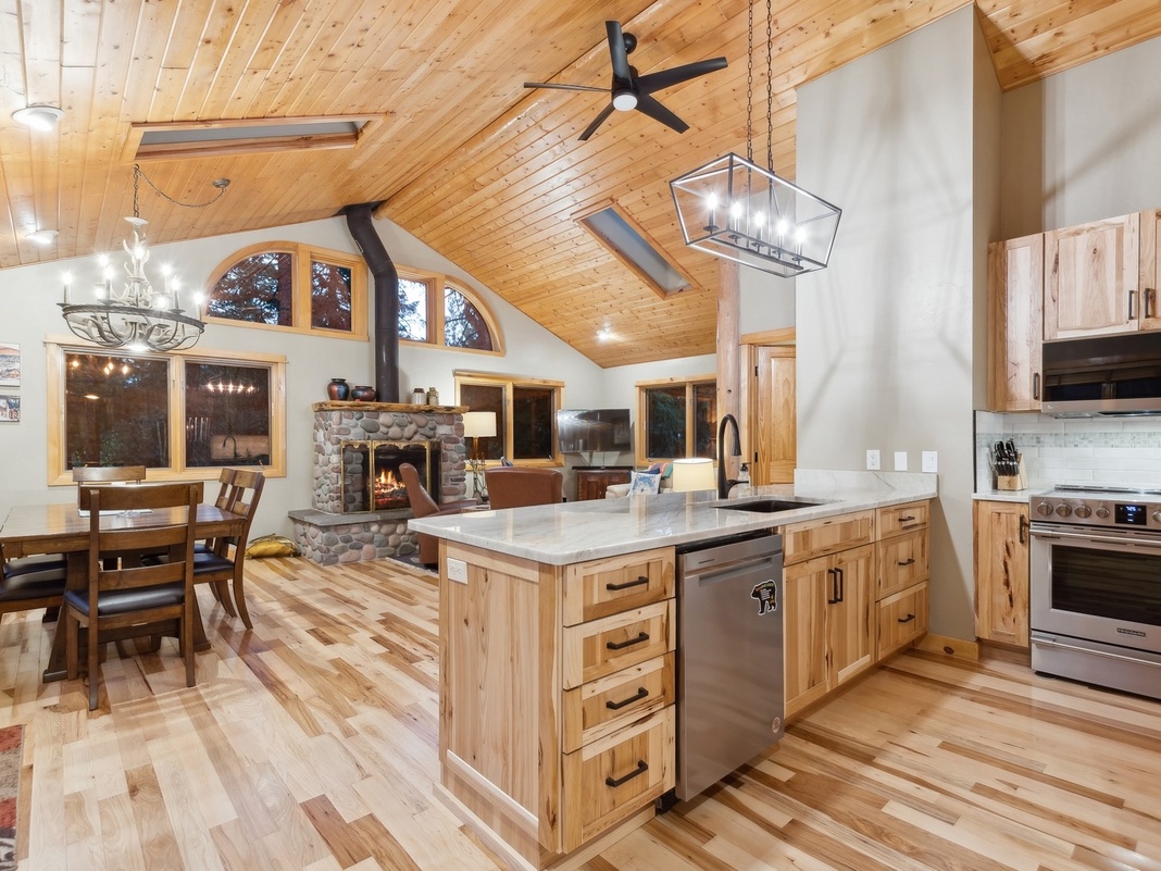 Enter this stunning home to discover a serene mountain setting. Near the entry is a desk and a laundry room to make stays more convenient. Continue into the great room, where natural light streams through the skylights on the vaulted, wood-plank ceiling. The fully equipped kitchen has high-end appliances and seamlessly integrates with the living and dining areas. Whip up a meal to share at the 6-person dining table, or step outside to eat alfresco on the balcony, surrounded by the treetops. In the living area, a stone fireplace, mountain décor, and a luxurious sectional create a charming spot to curl up and escape from worries. When night falls, retire to the primary bedroom with a queen bed and private bathroom on this floor.
