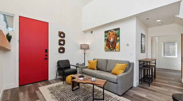 The Primary Suite has a King-size bed, a spacious closet, and an en-suite full bath. The bathroom is a gorgeous 5-piece bath with a large tub, stand-up tile shower, double vanity, and a separate room for the toilet. The upstairs open lofted bedroom has a Queen over Queen bunk making it so versatile for different group sizes! This level has a full bathroom with a stunning stand up shower. There is a stacked washer and dryer in the home for your laundry needs! The property comes with a covered parking spot! You owe it to yourself to stay in this stunning Quarry Home