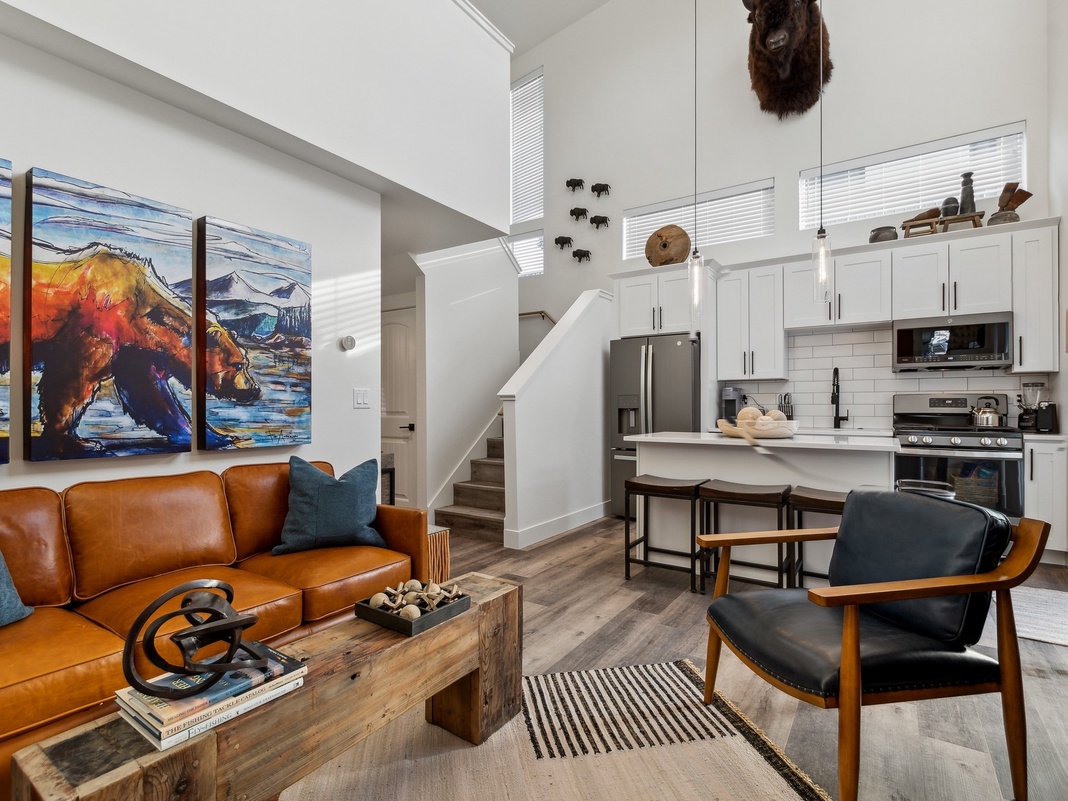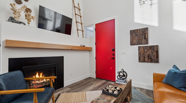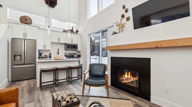 DETAILS: This brand new home has an open floor plan with 1000+ sqft of living space with all the comforts of home. The property comes with an inviting living room with a large flat-screen TV, fireplace, and cozy seating. The open kitchen has stainless steel appliances and stunning quartz countertops with stools for additional seating. It is equipped with all the pots, pans, dishes, and utensils you will need to prepare a meal!