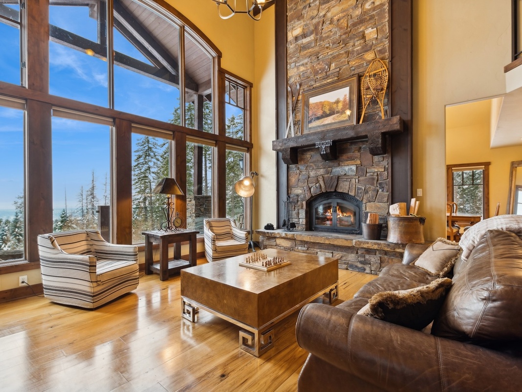 Upon entering this remarkable 3-story retreat, guests are immediately enveloped in the warmth and charm of a serene alpine lodge. The main-level entryway leads friends and family into a magnificent great room featuring soaring cathedral ceilings and a sweeping wall of windows highlighting scenic outdoor views. Sink into 2 cozy armchairs or stretch out on the soft leather sofa to share stories with loved ones as flames dance in the wood-burning fireplace. Steps away, a convenient breakfast bar seats 4, offering a quaint spot to sip coffee or chat with the chef as they prepare snacks in the adjoining kitchen—featuring high-end appliances and a deep farmhouse sink. Luxury meets the open air on the covered outdoor deck, where guests can fire up the propane grill and gather around the alfresco dining table for a shared meal on bluebird days. Retire to the peaceful primary bedroom on this floor, boasting a plush king bed, 55" TV, and a private bathroom with a jacuzzi tub. A laundry room adds convenience.