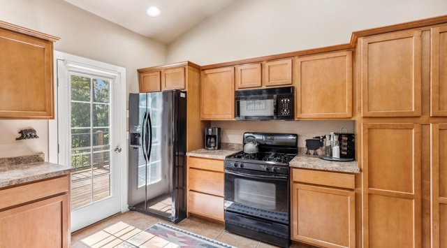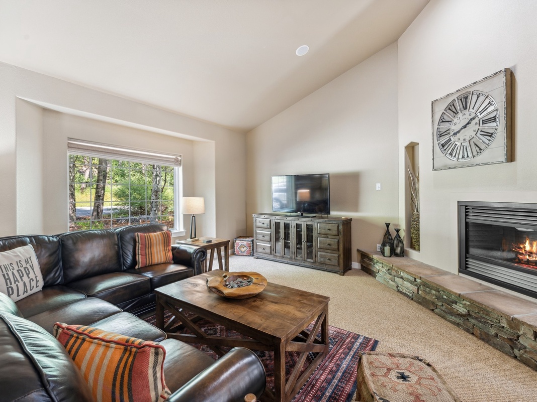 Step inside this 2-story home to find an open-concept great room with vaulted ceilings and a corner gas fireplace that can be enjoyed in both the living and dining spaces. Curl up on the leather sectional sofa and indulge in a quiet night unwinding in front of the 55” Roku TV. Streaks of sunlight illuminate the spacious kitchen, which is fully equipped and includes a breakfast bar with seating for 3. Dig into a hearty breakfast at the 6-person dining table while planning the day’s adventure. Out the kitchen door, a back deck with a grill and an outdoor table for 8 provides a stunning view of the forested landscape. A primary bedroom with a king bed, private bathroom, and deck access is on this floor.