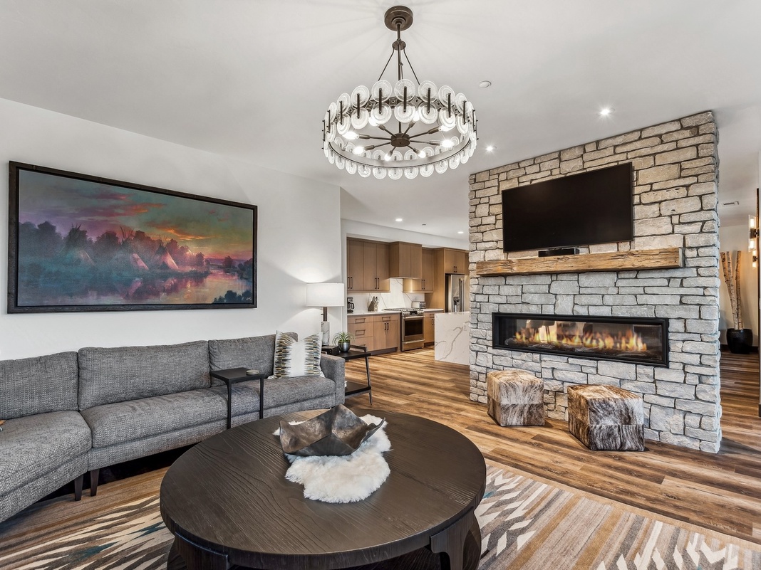 Enter into this third-floor penthouse, where guests will be immediately greeted by a luxurious and modern kitchen with high-end appliances, including a gas range oven. The spacious kitchen island with a built-in sink also serves a convenient breakfast bar for 4. Adjacent to the kitchen is a traditional dining area with enough seating for 8 people. Glass doors allow an abundance of natural light to fill the space, creating a warm and inviting atmosphere. A pass-through gas fireplace connects the dining area to the living area. In the living area, an oversized sectional sofa, 2 armchairs, and a TV mounted above the fireplace is the ideal spot to spend quality time together. For a more theater-like experience, close the door to the cozy TV room and enjoy a family movie night on the comfy sleeper sofa—accommodating 2 more guests. Conveniently tucked away in the hallway is a stacked washer and dryer to keep ski gear fresh and clean. From the dining area, step outside to the third-story deck for stunning views of the mountains. Perfect for entertaining friends and family, sit around the gas firepit on comfortable patio furniture with après ski drinks, relax tight muscles in the private hot tub, or treat guests to freshly cooked food hot off the grill. Discover 3 exquisite bedrooms at the end of the hallway, all with private bathrooms—1 primary bedroom with a luxurious king-sized canopy bed and private balcony access, 1 guest bedroom with 2 twin beds, and 1 other guest bedroom with a king bed, private balcony access, and access to the complex hallway, which leads to the elevator. Experience luxury, comfort, and convenience all in one place.