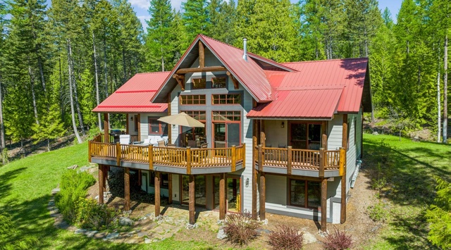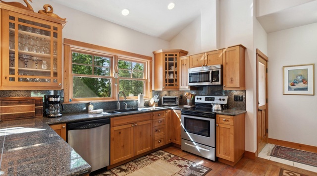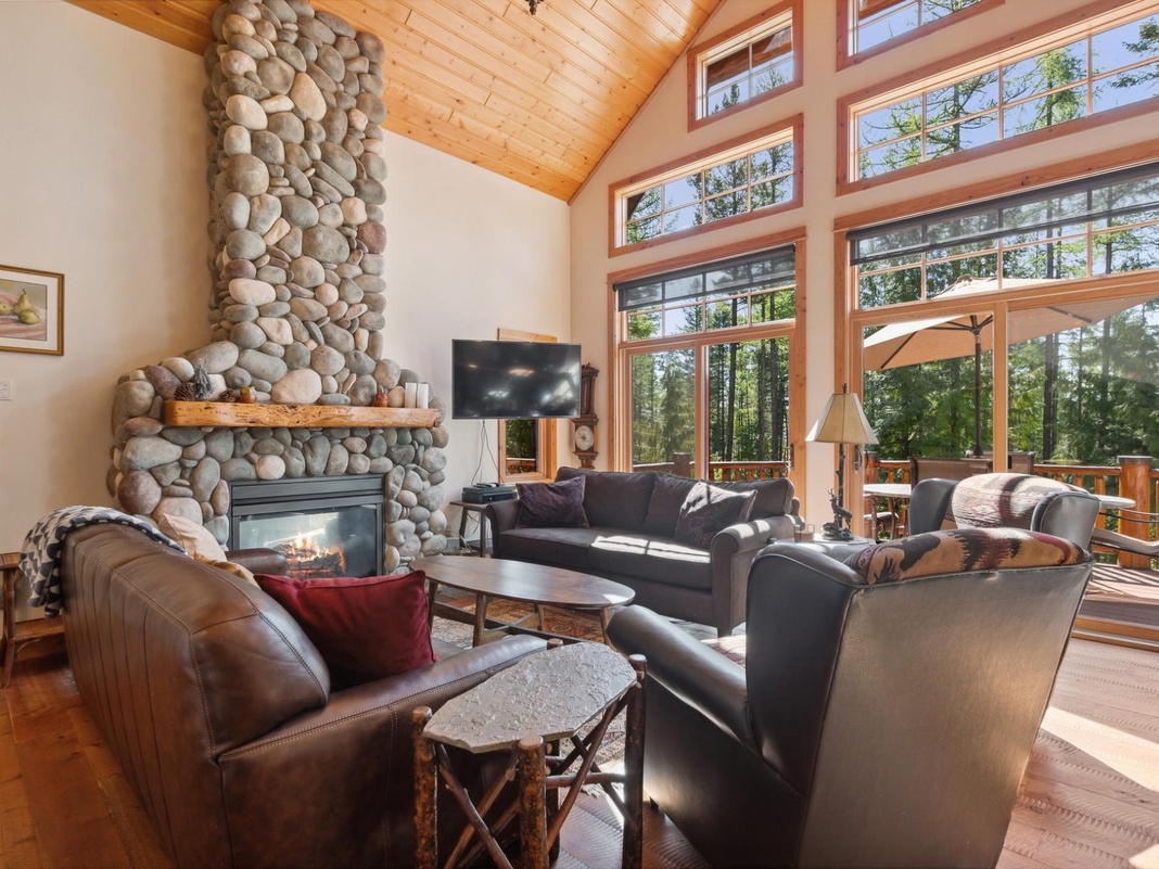 Nestled in the heart of Montana's secluded scenery is this gorgeous 2-story home with a loft. Wood floors, tall ceilings, and large windows create a bright ski lodge atmosphere surrounded by stunning forest and mountain views. The open floor plan offers a spacious living area with plush furnishings in front of a beautiful, stacked stone fireplace and TV. The vibrant kitchen features high-end appliances, granite counters, and everything necessary to prepare a home-cooked meal. An adjacent dining area seats up to 8 guests around a traditional dining table, with 3 additional seats at the breakfast bar. Enjoy beautiful Montana weather on the lovely deck off the great room, with comfy outdoor furniture, an alfresco dining table, and a BBQ grill. When it's time to retire for the night, head to the primary bedroom on this floor, boasting a queen bed, fireplace, private bathroom, and private deck access.