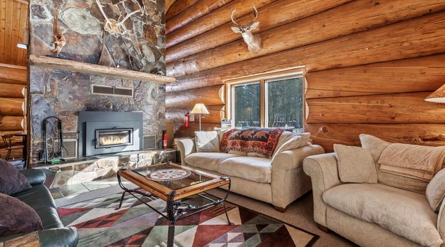 This authentic log cabin boasts an open floor plan and cathedral ceilings with natural colors and textures that create the ideal setting for a cozy mountain retreat. A wood-burning stove and plush furnishings, including a sleeper sofa, beckons friends and family to relax after a long in the living area. The remodeled kitchen has everything needed to prepare a family feast. A traditional dining area seats 8, while the rustic kitchen island seats 6 more. There are 2 bedrooms on the main floor—1 primary bedroom with a queen bed, private bathroom, and relaxing patio, and 1 guest bedroom with a queen bed and inviting atmosphere. Experience the ultimate outdoor oasis on the spacious covered deck with plenty of seating or on the beautifully manicured lawn with space for volleyball and other games. Plus, a convenient side patio is equipped with a grill and picnic table for delightful alfresco meals.