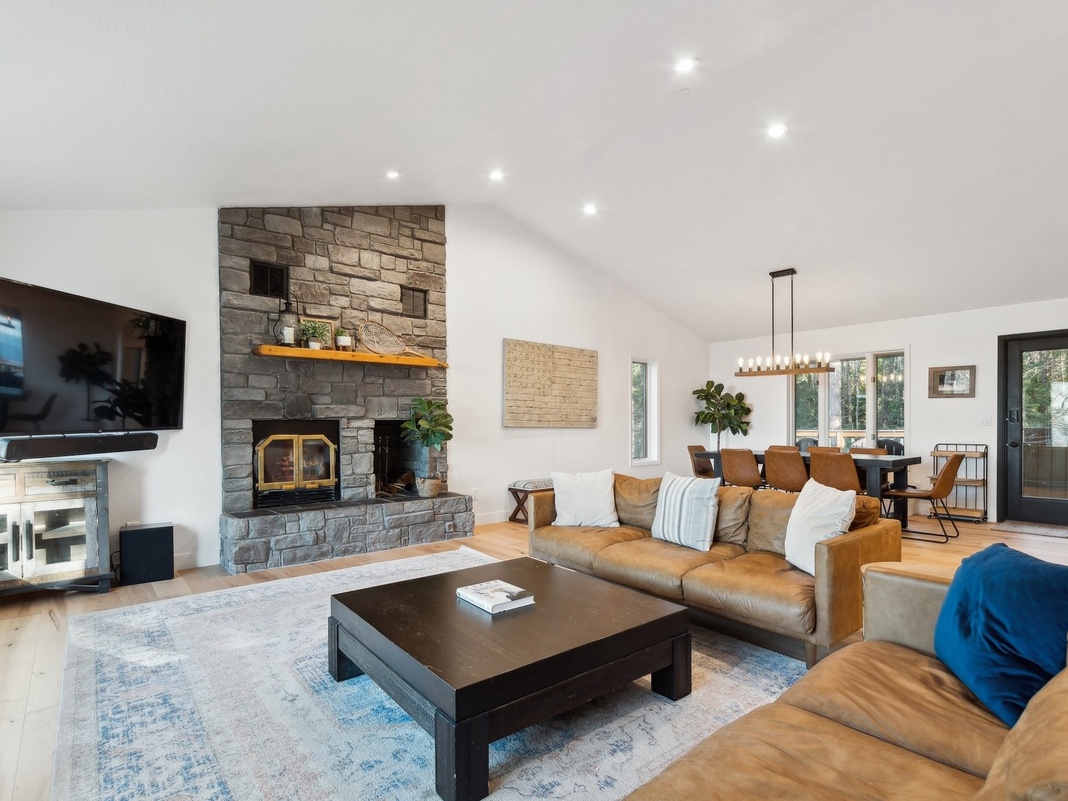 The floor plan is open and inviting. You'll love the cozy living room with a fireplace, large flatscreen TV, and seating for all! The Kitchen features stainless steel appliances and is stocked with all the pots, pans, dishes, and utensils you will need for preparing a meal! The large dining room table is a perfect place to enjoy a meal together!