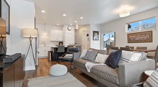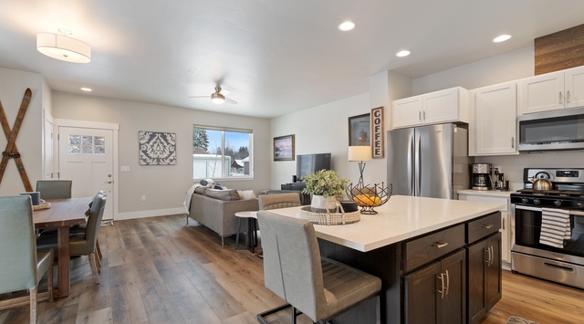 Step inside and be greeted by the warmth and elegance of this 2-story retreat, with abundant natural light cascading over the open floor plan. The modern rustic design and comfortable new furnishings, including a high-end leather sofa and armchairs, gives this space an inviting and cozy feel. A pristine white kitchen beyond the living area is beautifully designed with pristine white cabinetry, sleek appliances, and enough counter space to prepare even the most complicated meals. Pull up 1 of 4 leather stools at the kitchen island for a quick bite to eat, and when it’s time for a savory sit-down dinner, the family-sized dining table seats 6 comfortably. A private patio off the main living area provides space for outdoor entertainment with a BBQ grill and great views.