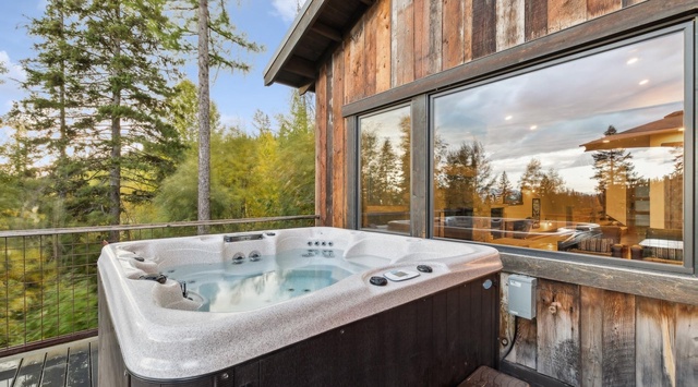 Enjoy the mountain views from the expansive outdoor deck, complete with a propane grill, an alfresco dining table, and a private hot tub.
