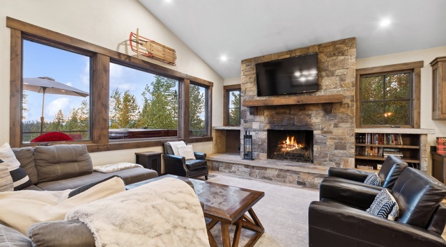 A spacious and inviting open floor plan welcomes guests to this 3-story home. The stunning great room boasts cathedral ceilings and breathtaking views of the slopes and mountains. The main floor features reclaimed wood floors and tile, as well as a grand fireplace, adding a touch of warmth to the space. Sink into the plush sofa or relax on the leather chairs with family in the spacious living area with a TV. Prepare culinary delights in the fully equipped kitchen, boasting commercial-grade appliances and stunning granite countertops. Gather with loved ones around the traditional 10-person dining table, with 4 extra seats at the breakfast bar.