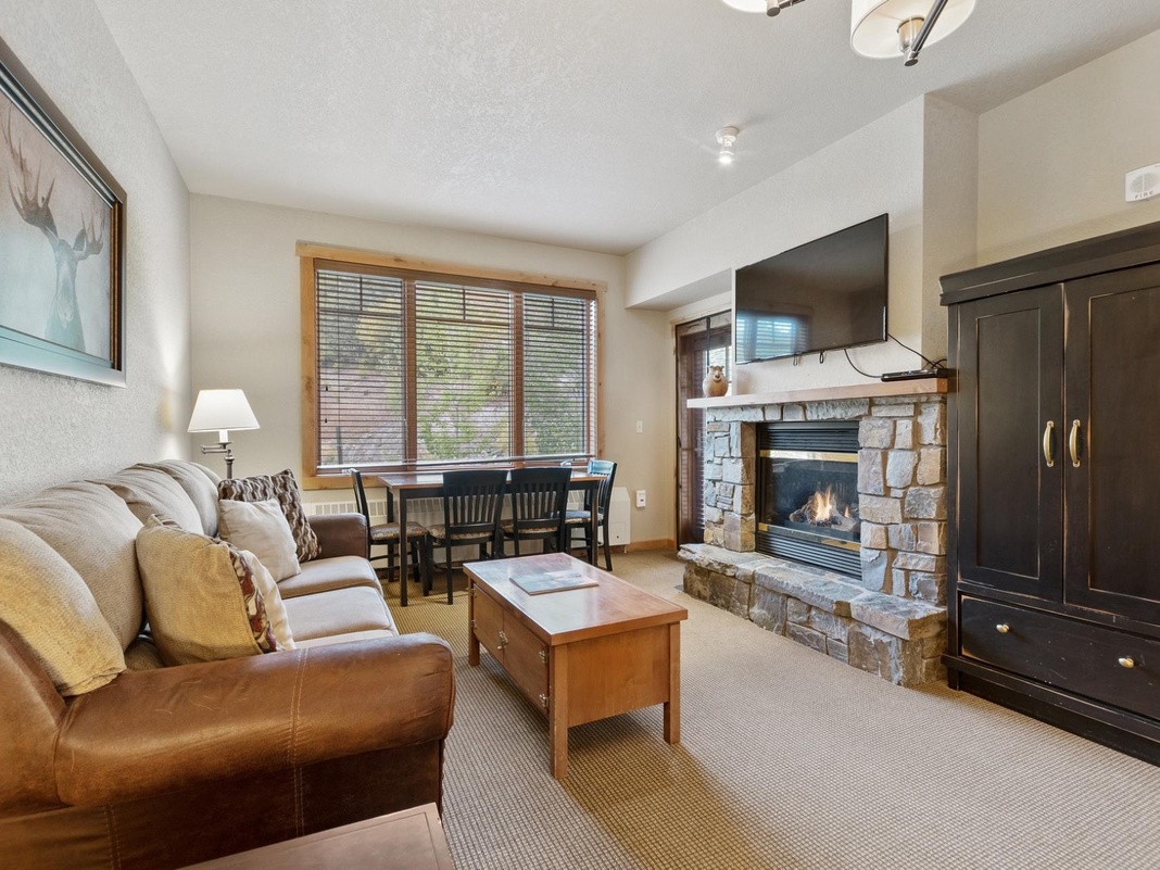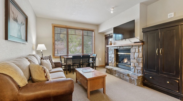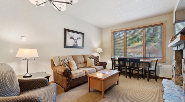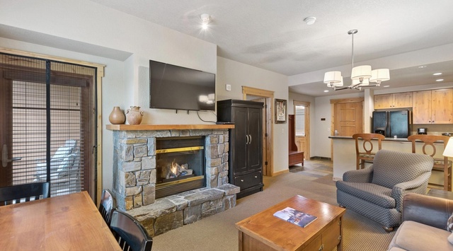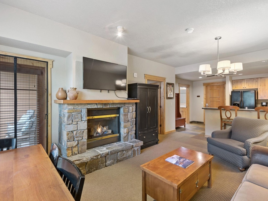 Enter this warm mountain condo, where natural light and comfortable furniture create a welcoming interior. A convenient hall tree with a bench provides the perfect spot for hanging Winter coats and putting on boots. To the left is a fully equipped kitchen with a breakfast bar for 2. The open layout is great for prepping meals and snacks without missing out on the group discussion! After a day out in the snow, enjoy a warm, well-deserved dinner at the 4-person dining table. Then, settle into the living area and get cozy in front of the gas fireplace while watching TV. Sip a cup of cocoa or a nightcap on the balcony while enjoying the relaxing views of the resort. The primary bedroom has a king bed, private bathroom, and a balcony, while the other side of the condo offers a guest bedroom with a queen-over-queen bunk bed. A washer and dryer means guests can plan for longer stays!