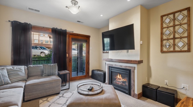 Step into this lovely condo through the inviting front patio, leading to a spacious great room awash with natural light. The living area is a haven of relaxation, featuring a gas fireplace, a plush sectional, and a new 55" TV—ideal after a day of exploring the area. Beyond this space, there's a dining table that comfortably seats 6 for sit-down meals, set in a chic arrangement with chairs and bench seating. The dining area is perfect for family game nights, too. The adjacent kitchen is a culinary dream, fully equipped with high-end appliances, including a gas range, granite countertops, and all the necessary cookware and utensils. Down the hallway is a stacked washer and dryer, as well as 2 comfortable guest bedrooms, both with queen beds and spacious closets. On the opposite side of the home is a luxurious primary bedroom with its own wing of the condo, boasting a king bed, coffee bar with a mini fridge, comfortable TV area with a sleeper sofa, and a private bathroom. Sip morning coffee on the private balcony before hitting the slopes or enjoy a glass of wine in the Summer while watching for shooting stars.