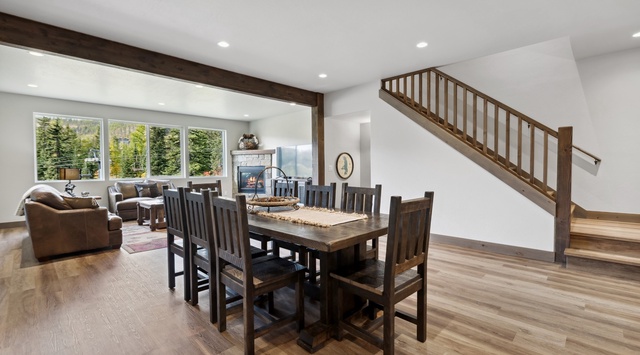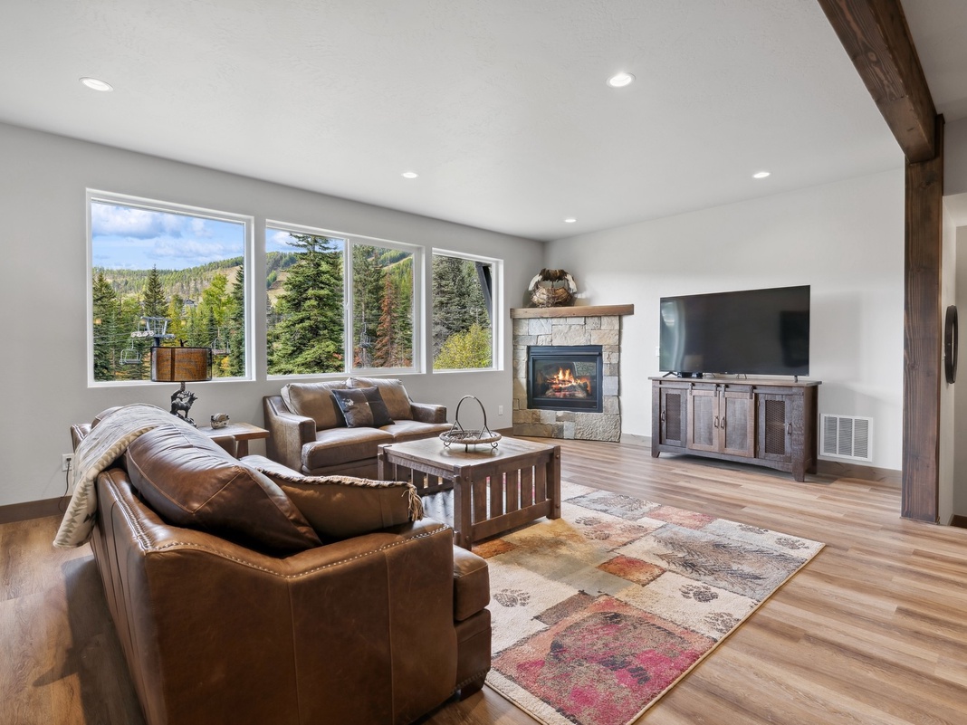 An open living, kitchen, and dining area are on the second floor. In the living area, guests can enjoy views of the chairlift and a crackling fire while relaxing on leather sofas surrounding a Smart TV. A dining table seats 8. Granite countertops, an eat-in island that seats 3, and a dry bar offer lots of space for guests to prepare delicious meals. A door off the kitchen opens to a spacious deck with a large hot tub, gas grill, and an outdoor table.