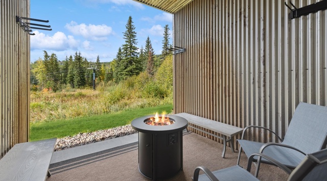 Guests entering through the 1-car garage can easily hang wet ski gear and boots on a boot dryer. Inside, an entry hall offers more hooks, spaces for bags, and a full-size washer and dryer. A guest bedroom down the hall has a king bed and a bathroom with a shower/tub combo. A covered back deck has a gas firepit and beautiful prairie views. Guests may also ski to Chair 9 or the Snow Ghost Express from Pioneer Peak’s back door!