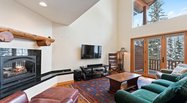 Discover the beauty and comfort of this stunning 3-story townhouse, with cathedral ceilings and large windows that showcase the spectacular views. The open and inviting floor plan is perfect for entertaining, with a stone-encased fireplace, TV, and plush seating. The equipped kitchen has wood cabinetry, gorgeous black countertops, and high-end appliances, perfect for prepping dinner. Enjoy meals together at the 6-person dining table, or even indulge in a game night. From the great room, friends and family can access the private deck to soak in the incredible Big Sky views. With its harmonious blend of rustic and modern, this floor is truly the heart of the home.