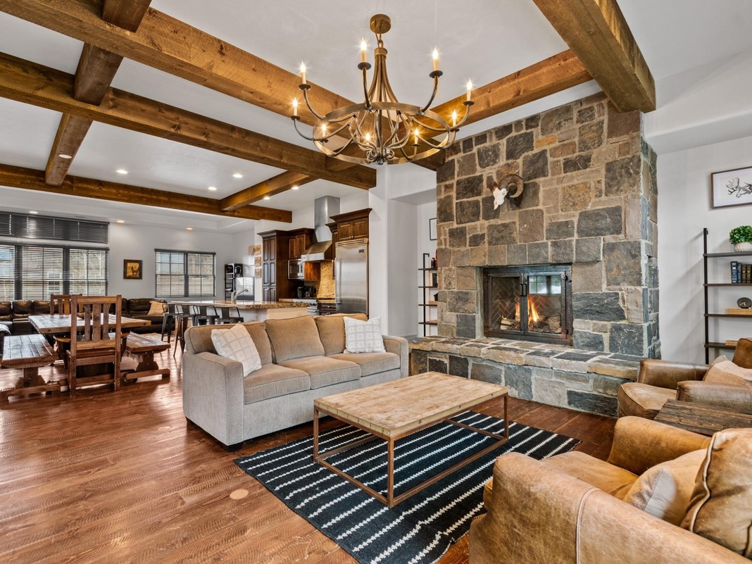 A stone entry sets the tone for this luxe take on a Big Mountain lodge. Stepping inside, guests will discover exposed timber beams, a stone fireplace, rich wood floors, and an open living, dining, and kitchen on the condo’s main level. The open kitchen features premium Viking appliances, granite countertops, a 6-burner gas range, and a dine-in island that seats 4. Guests can comfortably gather on a leather wraparound sofa while meals are being prepared and enjoy the 50” HD TV or dine at a spacious dining table that seats 12. A sofa and 2 leather armchairs surround a gorgeous stone fireplace, and doors open off the living space to a spacious patio, where guests can unwind in a large hot tub or cook steaks on a gas grill.