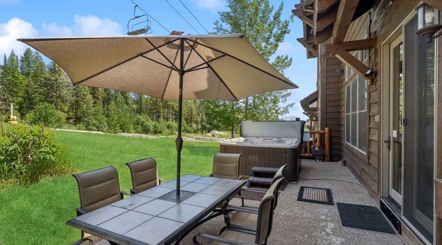 Comfort meets luxury in this stunning 3-story home. The great room boasts vaulted ceilings, large windows, and a rustic charm. With 2 living areas, it's the perfect place to relax after a long day on the mountain. Cozy up on comfy furnishings by the beautiful fireplace in the primary living area, or indulge in a family movie night with an impressive 82"TV in the entertainment area. The gourmet kitchen makes cooking a feast easy, with high-end Viking appliances, spacious granite countertops, and a gas range. Perfect for entertaining, a large dining room table seats 8, with 6 additional seats at the adjacent breakfast bar. Enjoy the private patio oasis, boasting an outdoor grill and alfresco dining table for 6. There's also a private hot tub, perfect for relaxing muscles after a day on the slopes. Ski access is also conveniently located off the patio, and there's even a storage space for gear and boots in the primary living area.