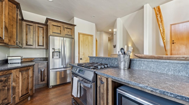 Enjoy access to the ski-in/ski-out trail at the end of the road, a quick 5-minute walk away. Welcome to this stunning 3-story home, where guests are greeted by an expansive great room. The floor plan is open and inviting, with large windows that let in ample light and offer spectacular views of Montana's natural beauty. The finely appointed living area boasts a gas fireplace and a comfortable sectional in front of a large TV, making it the perfect spot to relax. Meanwhile, the pristine kitchen includes spacious countertops, high-end appliances, and all the amenities of a home. When it's time to dine, gather around the elegant table that seats 6, while the breakfast bar can accommodate 4 more. There are 2 luxurious bedrooms on the main floor—both primary bedrooms have a king bed and ensuite bath, both with TVs and private bathrooms. Take in fresh air and spectacular views from the balcony off the living room, or soak in the private hot tub off the back deck.